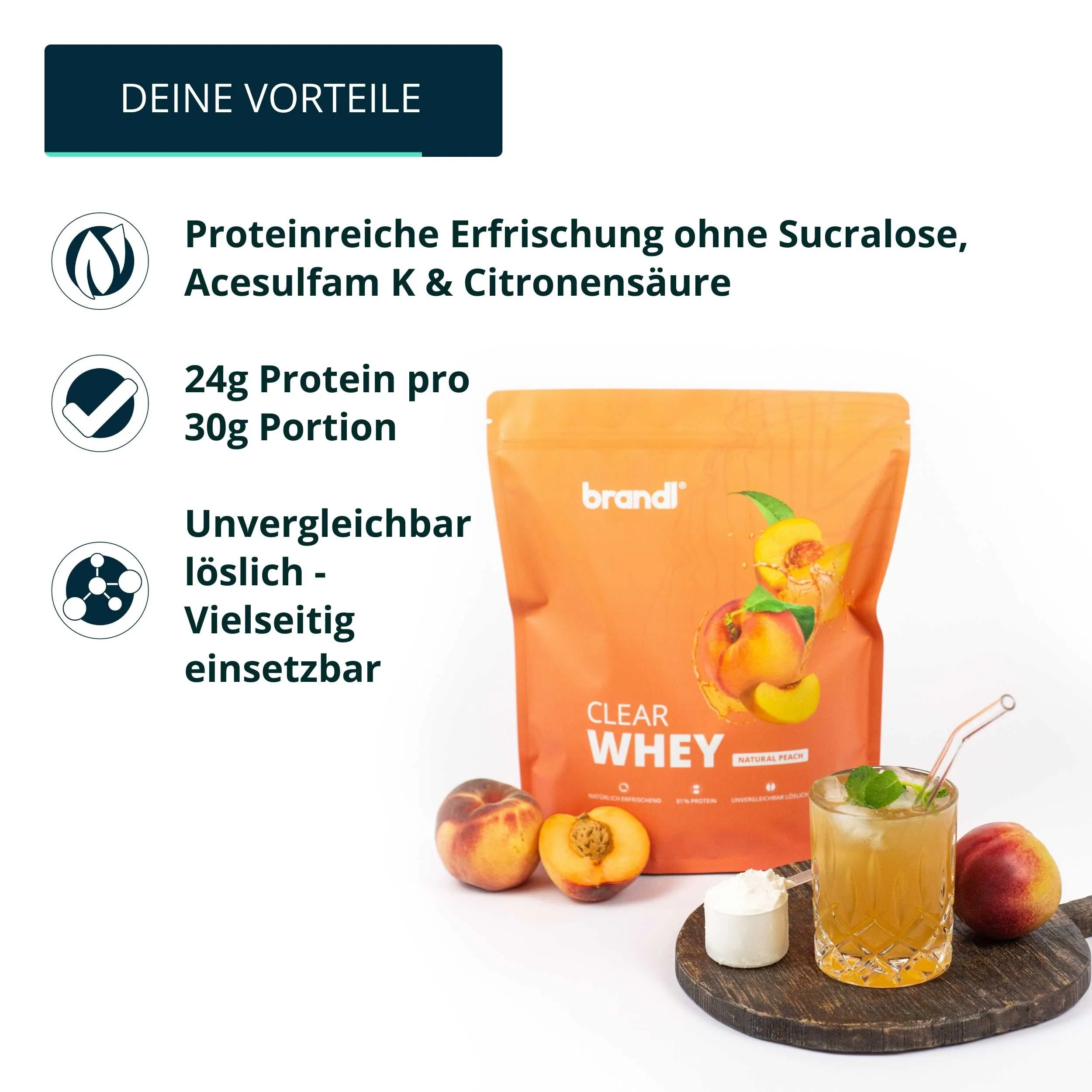 - mit den verlockenden Geschmacksrichtungen Cherry Splash, Green Apple, Mango Maracuja und Natural Peach bietet das brandl® Clear Whey eine einzigartige Vielfalt für deinen Genuss. Proteine spielen eine entscheidende Rolle für gesundheitsbewusste Personen: Sie tragen nicht nur zur Zunahme an Muskelmasse bei, sondern auch zur Erhaltung von Muskelmasse und normaler Knochen