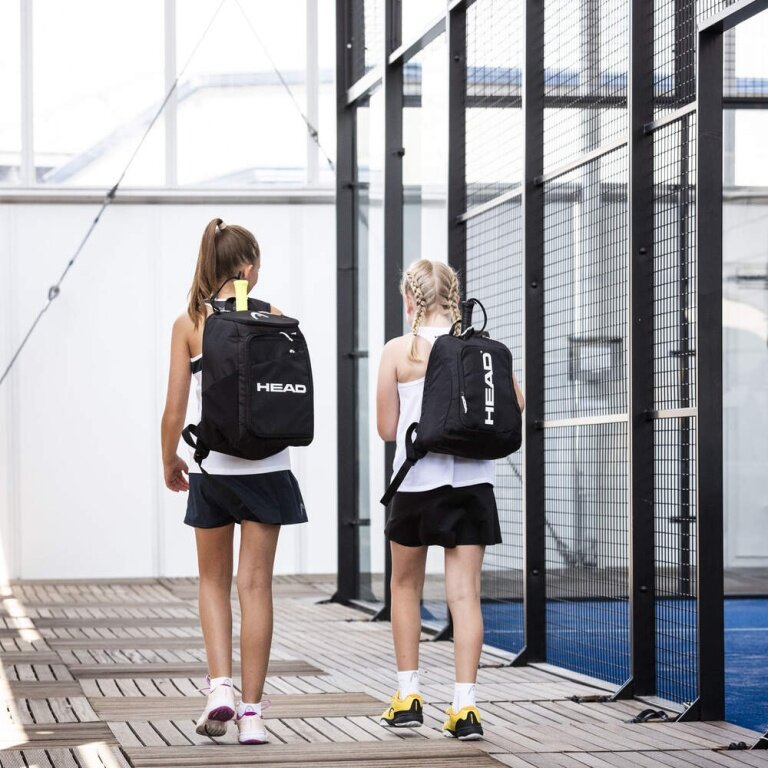 - Junioren können alles, was sie brauchen, in einem Rucksack mit einem Hauptfach, einem Rückenfach für einen Schläger und einem Zubehörfach mit Reißverschluss auf der Vorderseite transportieren.