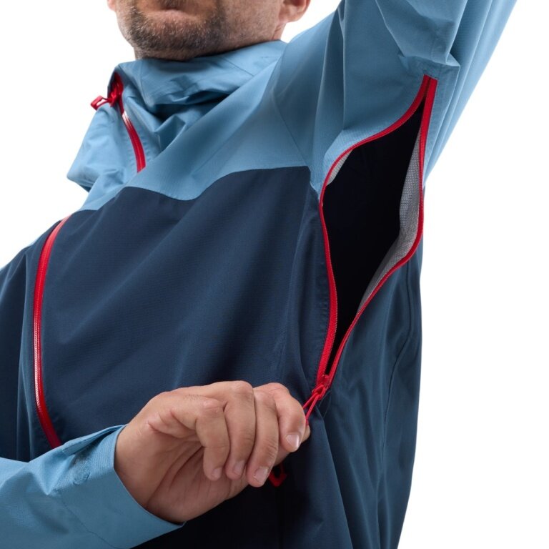 • trotz ihrer 2,5-Lagen-Konstruktion ist sie sehr leicht. Belüftungsreißverschlüsse unter den Armen regulieren die Wärme beim Aufstieg.
