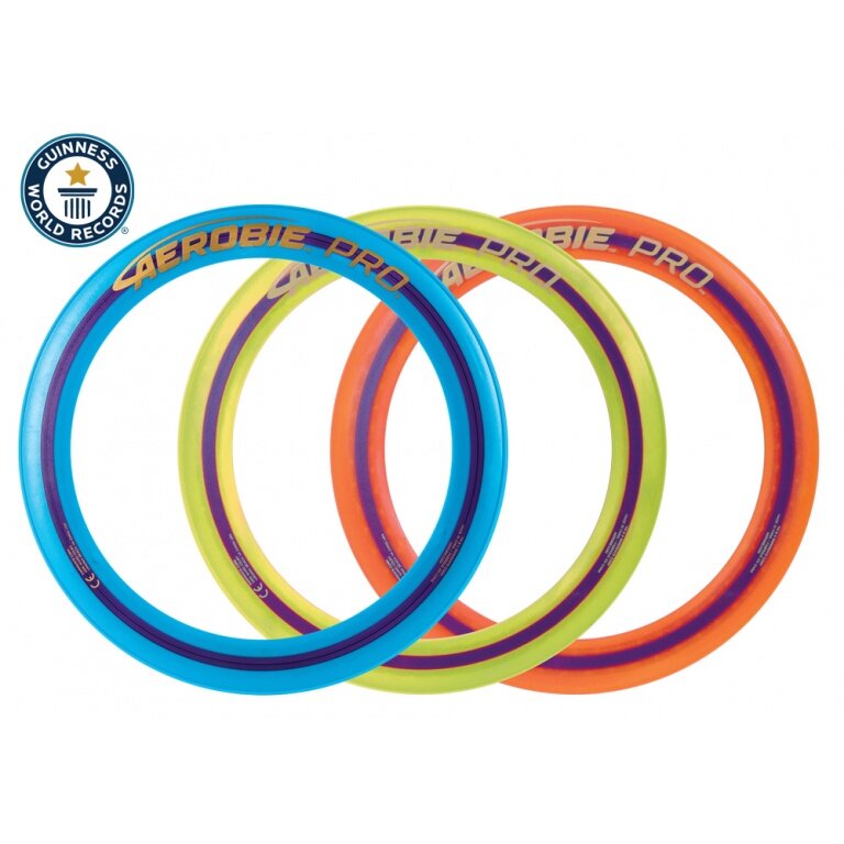 • Aerobie Wurfring (Ø33cm), der Weltrekordhalter mit Eintrag im Guinness-Buch durch einen 406m-Flug über die Niagara-Fälle, enorme Flugweiten, präziser Flug und eine wertige, technische Bauweise haben die Aerobie Ringe so beliebt gemacht