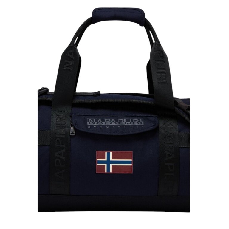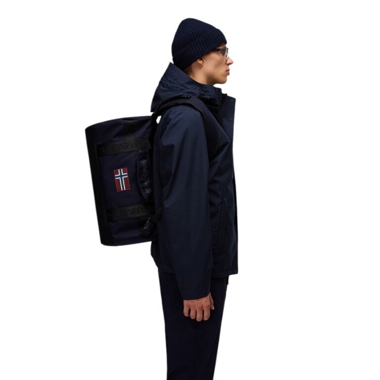 • sie wurde mit leichtem Polyester ausgestattet, das vielseitiger für das Reisen ist, und verfügt über einen Zwei-Wege-Reißverschluss, kurze Tragegriffe, den norwegischen Flaggen-Aufnäher und den charakteristischen Napapijri Geographic-Aufdruck.