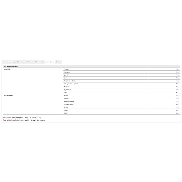 • zudem überzeugt es durch einen natürlicherweise hohen BCAA-Anteil von ca. 25%