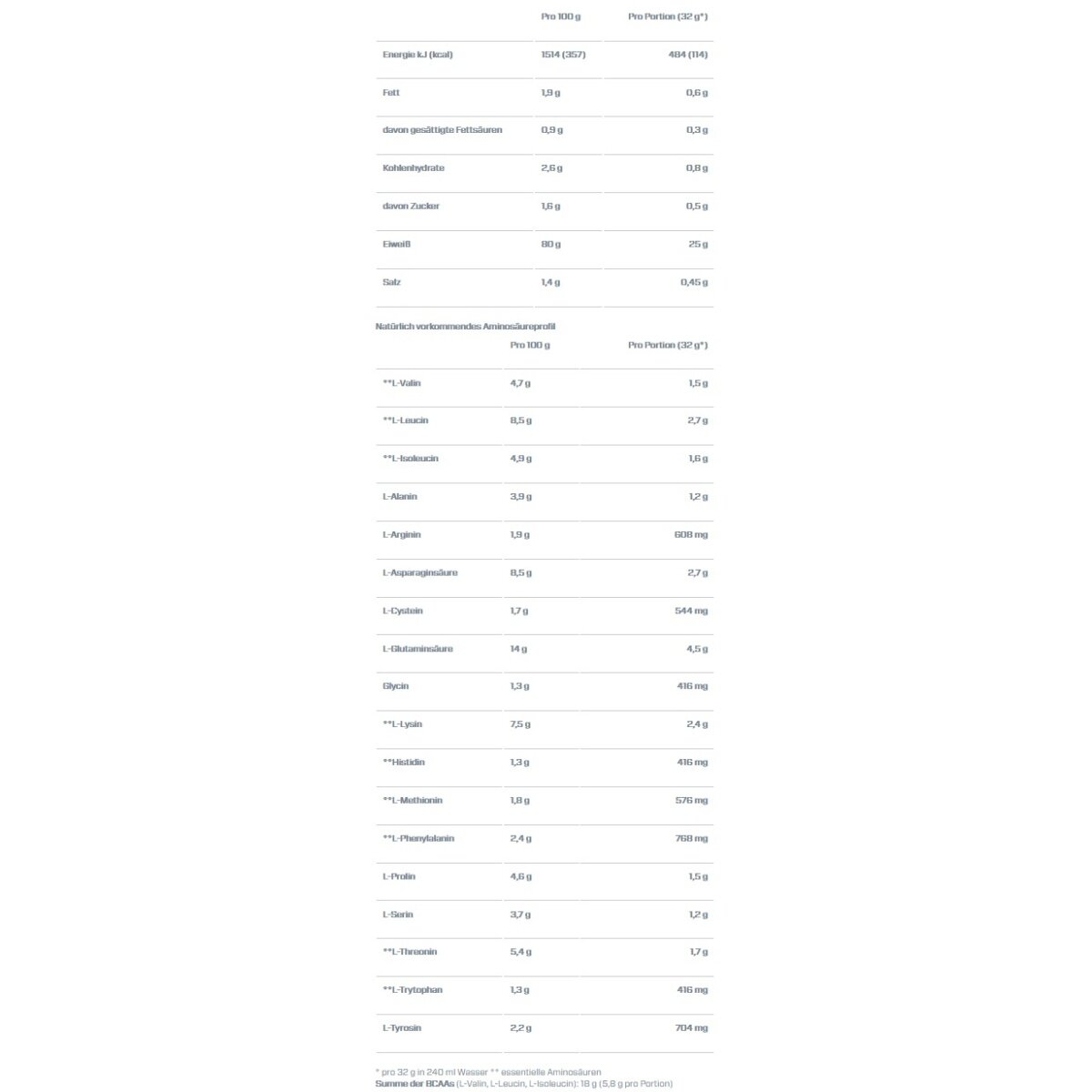 • jede Portion enthält 5,6–5,8 g BCAAs und davon 2,6–2,7 g der wichtigen Aminosäure L-Leucin, abhängig vom Geschmack