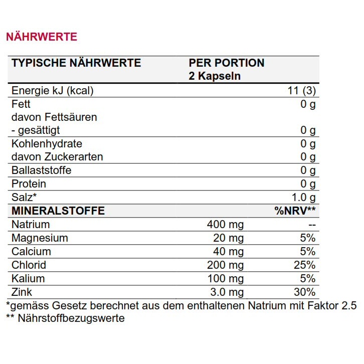 • 2 Kapseln Salt Caps mit 400 mg Natrium, entsprechen 750-1000 ml Sportdrink