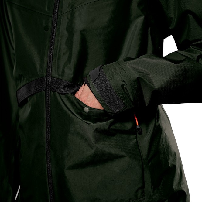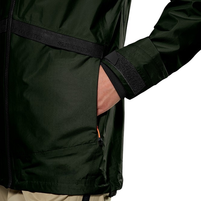 • in den anderen Bereichen schützt ein leichteres 2,5-Lagen-Powertex®-Ripstop, das für Bewegungsfreiheit sorgt und zusätzlich mit einem geringen Packmaß punktet. Beide Materialien besitzen eine Wassersäule von 10.000 Millimetern