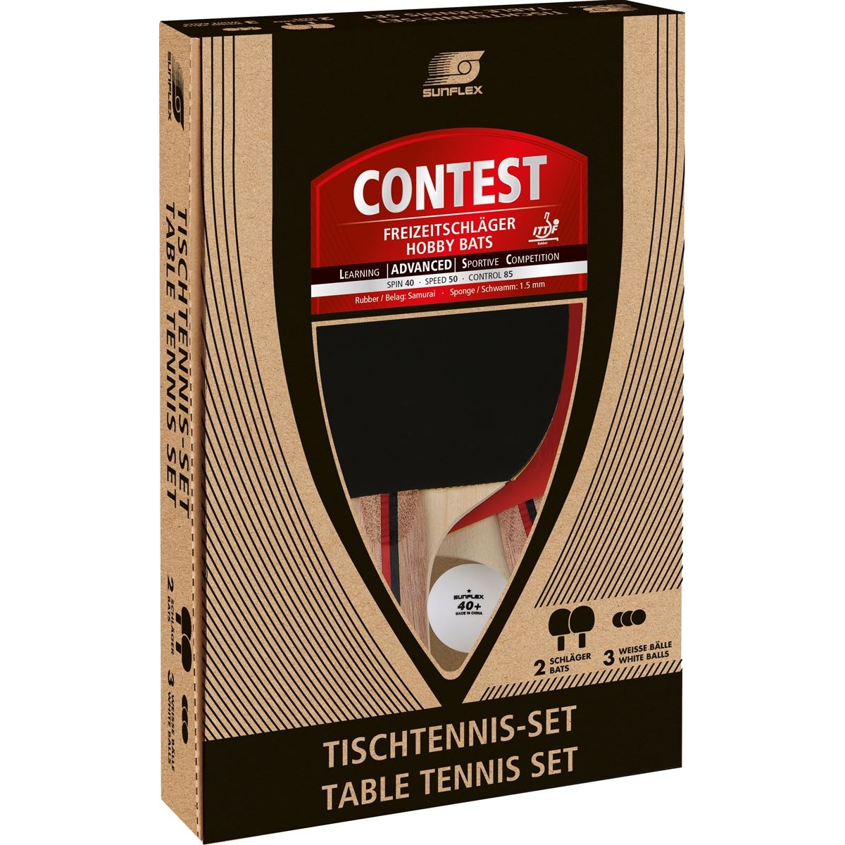 Sunflex Tischtennisschläger Set Contest - 2 Schläger mit Samurai Belag, Noppen innen mit 1,5mm Schwamm + 3 Bälle Kartonverpackung