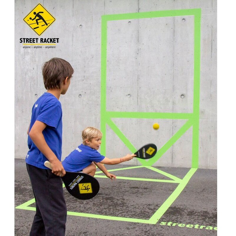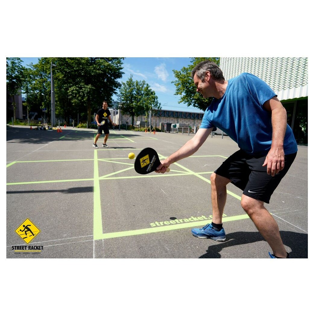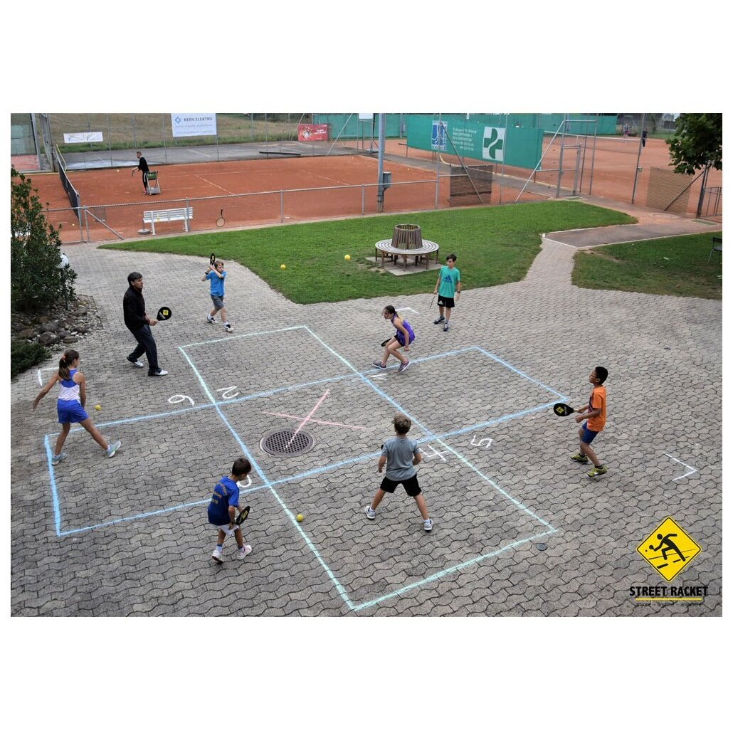 • einfach mit der beliegenden Kreide eine Court bspw. auf den Pausenhof oder Parkplatz zeichnen und los gehts - aber auch am Strand, im Schnee, in der Halle, am Gang im Büro - überall kann Street Racket gespielt werden!