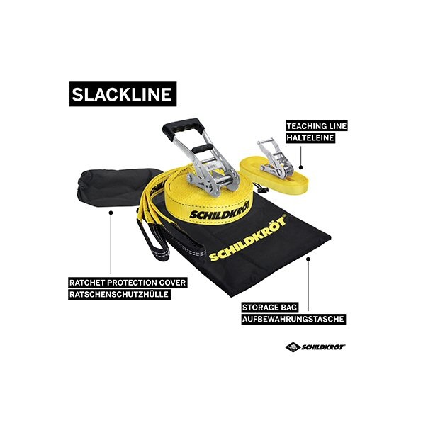 • Teaching-Line: zweite dünnere Line 15 Meter lang und 2,5cm breit als Handlauf, ebenfalls mit 1,8 Meter Schlingenband inkl. Ratsche zum Verschließen.Außerdem liegt dem 6-teiligen Set noch ein Ratschenschutz für die Haupt-Line bei, er schützt die Füße vor den Kanten der Ratsche