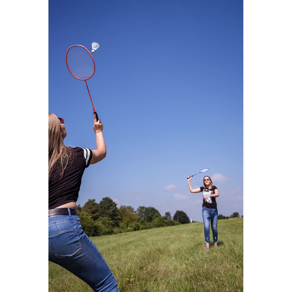 • Badminton Set sunflex MATCHMAKER 2 PRO mit 2 modernen Schlägern, 2 Federbällen und einem Netz mit Pfosten in praktischer Nylontragetasch