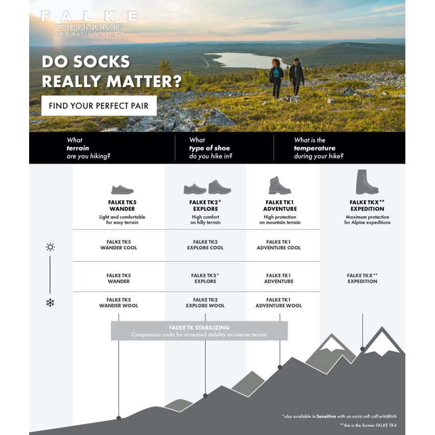 • durch die in den Schaft eingearbeitete Bergsilhouette in verschiedenen Farbschattierungen ist die Wandersocke ein echter Hingucker