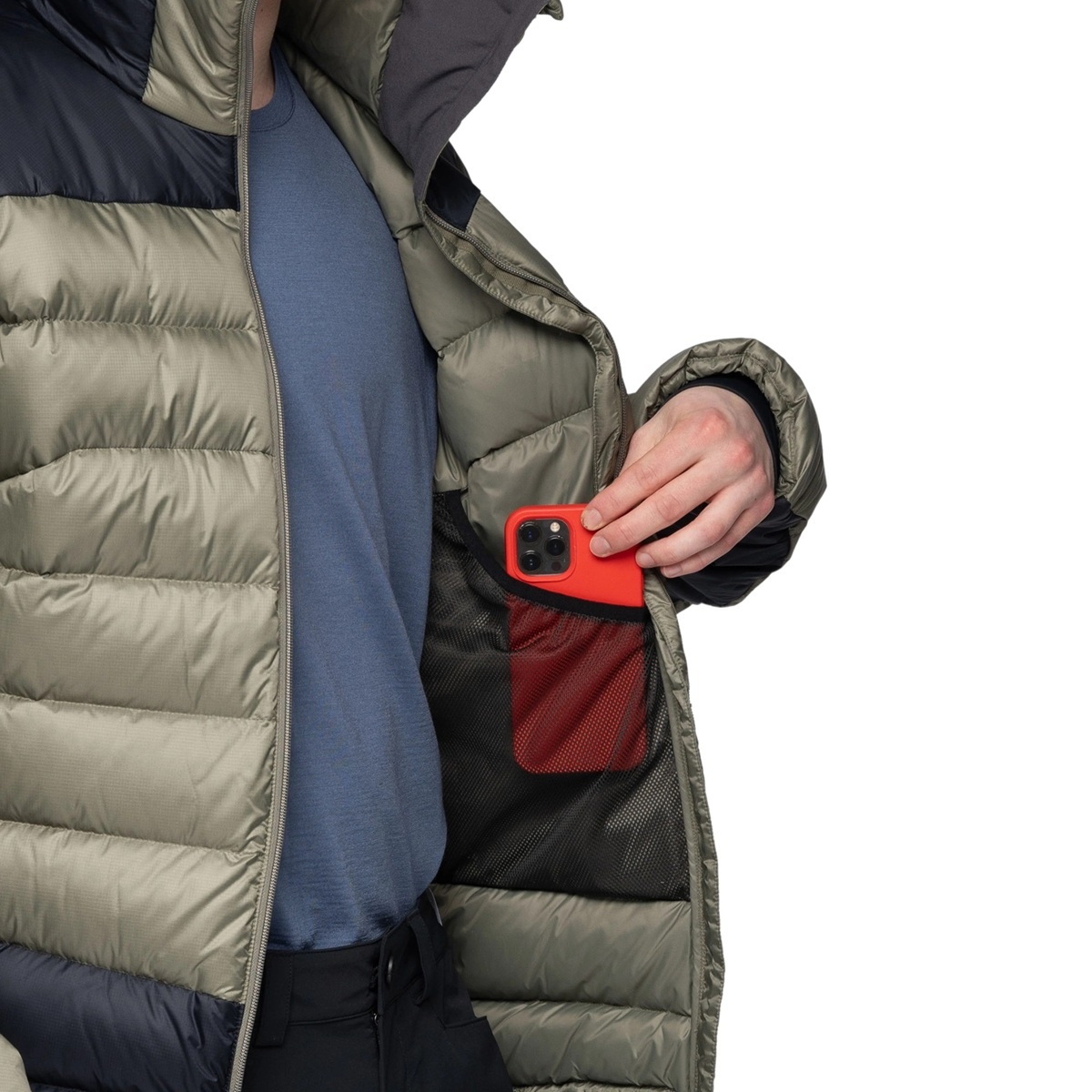 • das Produkt ist aus einem winddichten Hauptmaterial aus 100% recyceltem Polyamid mit PFAS-freier WR-behandlung gefertigt und mit recycelten Daunen gefüllt, die die Körpermitte warmhalten