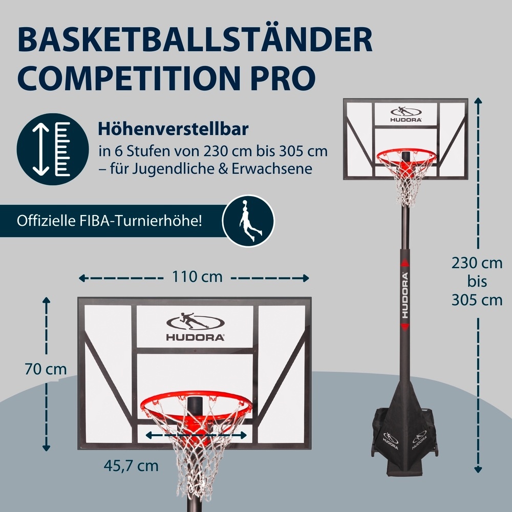 Hudora Basketballständer Competition Pro (höhenverstellbar/fester Stand/Sicher/langlebig) - 230cm-305cm