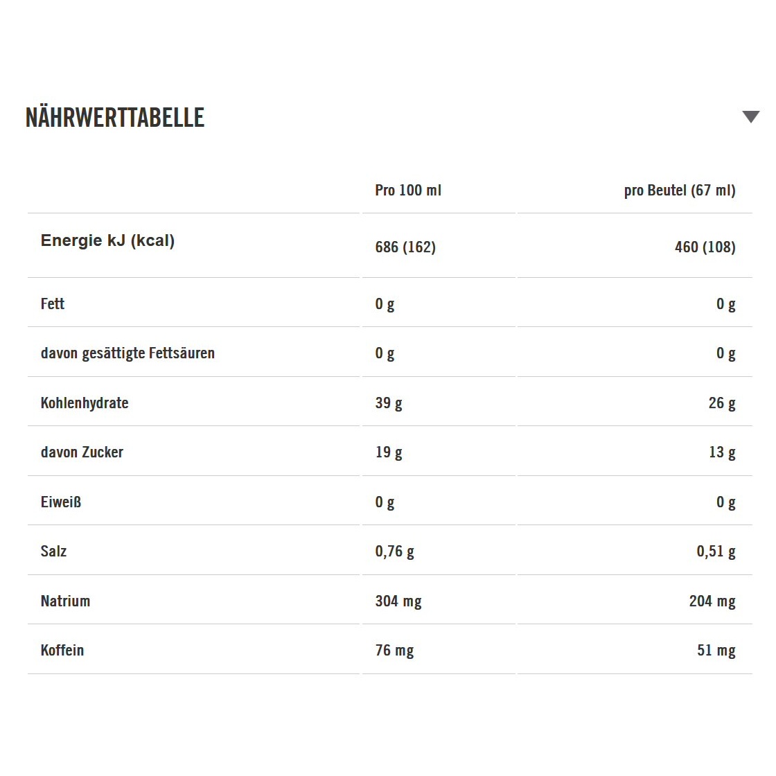 • Geschmacksrichtung Cola: Erhöhter Koffeingehalt (150 mg/100 ml; 100 mg/Beutel)